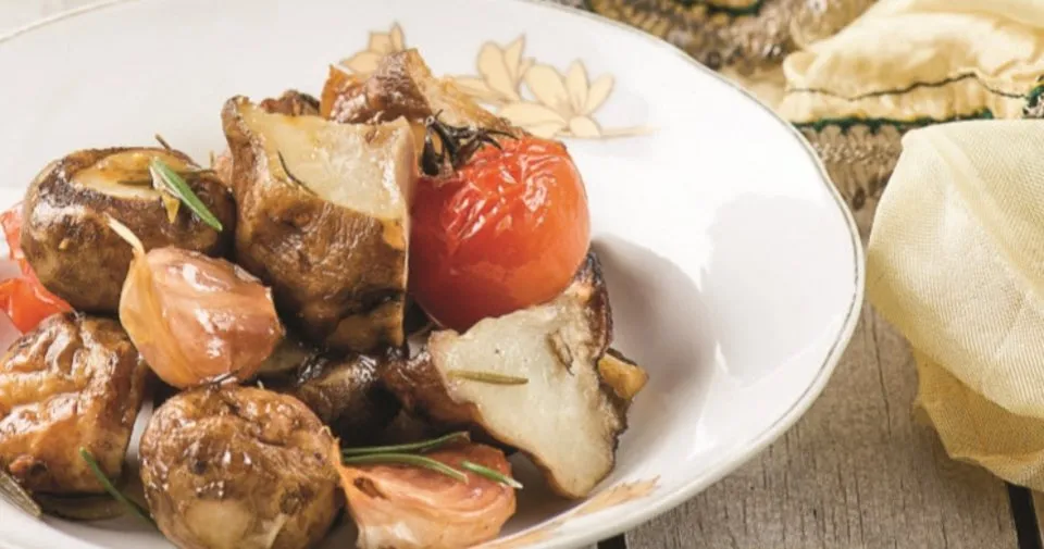 YERELMASINI kabuklu kullanacağımız için iyice fırçalayın ve irice doğradıktan sonra orta boy bir fırın kabına alın. Üzerine zeytinyağı, tereyağı, kabuklu halde diş sarımsak, biberiye dalları, tuz ve karabiber ekleyip karıştırın. Önceden ısıtılmış 180 derece fırında 30 dakika pişirin. Fırından alıp, domatesleri ekleyin ve karıştırın. Yeniden fırına verip, 15-20 dakika pişirin. Fırından alıp üzerine limon suyu gezdirin. Sıcak olarak servis yapın.