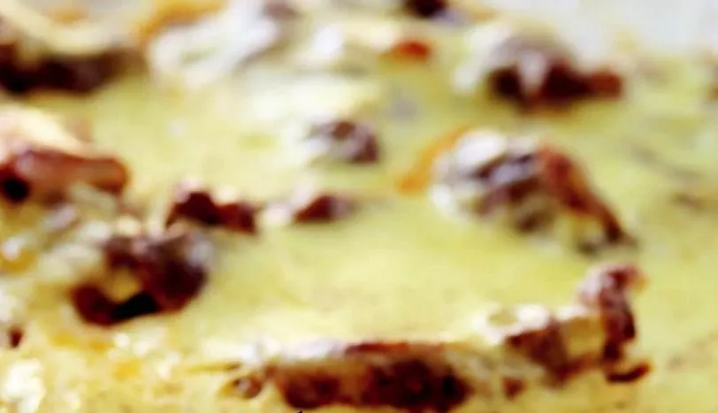 ETİ tencereye alın. Suyunu salıp yeniden çekene dek kavurun. Üzerine, salça ve su ekleyip, arada karıştırarak25 dakika haşlayın. Eti tepsiye alıp, tuzunu ayarlayın. Eti pişirdiğiniz suyun yarısını üzerine gezdirip, pirinci serpiştirin. Üzeri için yumurtaları çırpın. Yoğurt ve un ekleyip karıştırın. Karışımı, tepsideki etin üzerine her tarafına eşit gelecek şekilde dökün. Önceden ısıtılmış 220 derece fırında, yaklaşık 20-25 dakika pişirin. Sıcak olarak servis yapın.