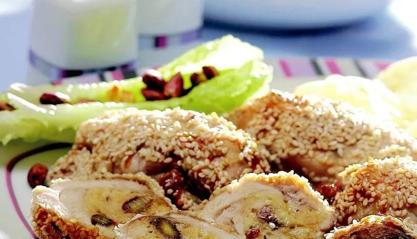 Tavuk butlarının kemiklerini çıkartın. İkiye bölüp inceltin. Tavuk kıymasının içine tavuk harcı, yumurta sarısı, margarin, rendelenmiş kaşar peyniri ve antepfıstıklarını ekleyip yoğurun. Tavuk etlerini düz bir zemine yayın. Üzerlerine tuz ve karabiber serpin. İçlerine hazırladığınız harcı paylaştırın. Etleri rulo halinde sarın. Ruloların üzerlerine yumurta akı sürerek susama bulayın. Fırın tepsisine dizin. Önceden ısıtılmış 180 derece fırında susamlar kızarana kadar pişirin. Sıcak servis yapın.