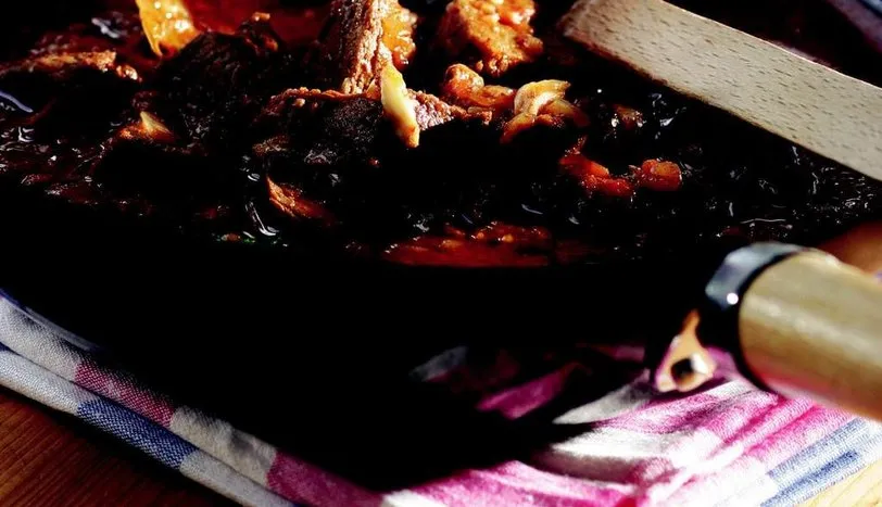 ETİ tencereye alın. Suyunu salıp, yeniden çekene dek pişirin. Küp doğranmış domates, piyazlık doğranmış soğan, ikiye bölünmüş sarmısak ve tereyağını ilave edip, soğanların rengi dönene kadar kavurun. Sirkeyi ekleyip, 30 dakika daha pişirin. Et suyu, defne yaprağı, karabiber, kimyon, mercanköşk ve tuzu ilave edin. Ara ara karıştırarak et yumuşayana kadar pişmeye bırakın. Sıcak olarak servis yapın.