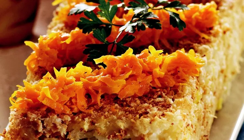 1 TEREYAĞINI bir tavada eritin. Üzerine bezelye, tuz ve karabiber ekleyip soteledikten sonra kenara alın. Parça tavuk, bütün soğan ve havucu 2 su bardağı tuzlu suda haşlayın. Tavuk eti, soğan ve havuçları sudan çıkarın. Tavuk ve havucu küp doğrayıp üzerine bezelye ekledikten sonra kenara alın. 2 Pirinç, küp doğranmış patates ve sütü haşlama suyuna katın. Suyunu çekene dek yaklaşık 20- 25 dakika pişirip ocaktan alın. Ilındıktan sonra çırpılmış yumurtalar ve kaşar peynirinin yarısını ekleyip karıştırın. Baton bir kek kalıbına çırpılmış yumurta akı sürüp, 1 çorba kaşığı galeta unu serpin. Pirinçli karışımın üçteikisini kalıba dökün. Üzerine havuçlu-tavuklu karışımı yayın. Yarım su bardağı rendelenmiş kaşar peynirini serpin. Kalan pirinçli karışımı üzerine dökün. Kalan galeta unu ve kaşar peynirini serpin. Önceden ısıtılmış180 derece fırında 25-30 dakika pişirin.3 Üzeri için zeytinyağını bir tavaya alıp rendelenmiş havucuekleyin. Tuz ve karabiberini ayarlayıp, 10 dakika pişirin. Daha sonra keki servis tabağına alın. Üzerine sote havucu ekleyerek servis yapın.