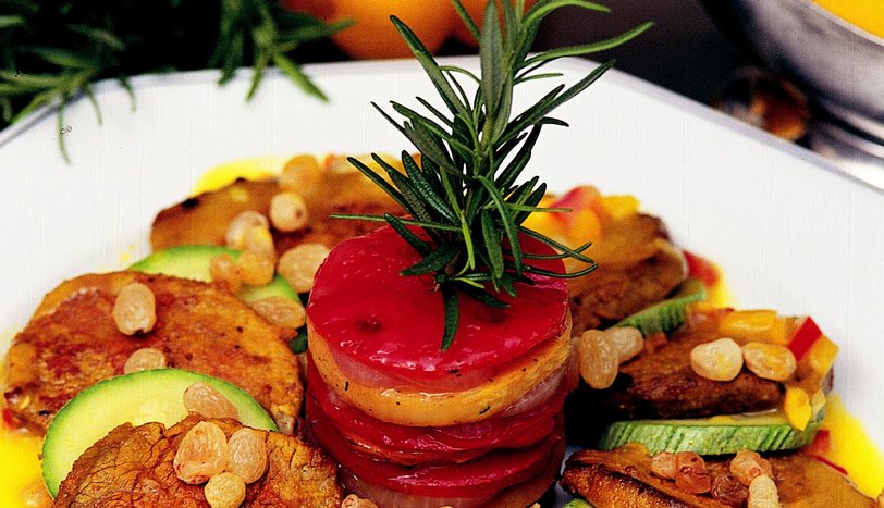 Süzgeçten geçirerek, başka bir kaba aktarın. Tuzunu ayarlayın. Kalan tereyağı ve zeytinyağını başka bir tavaya aktarın. Sırasıyla soğanı, dolmalık biberleri, zencefili, domatesleri ve defne yaprağını ekleyin. 6-7 dakika soteleyin. Hint biberli karışıma ekleyin. Sıcak kalacak şekilde bekletin. Kuru üzümleri 1 saat suda bekletin. Suyunu süzerek, bir kenarda bekletin. Temizlenmiş sığır bonfilesini 1 cm kalınlığında dilimleyin. Pirzola demiri ile çok az döverek, inceltin. Tuz serpin. Bir kapta karıştırdığınız hint biberi ve un karışımına bonfileleri bulayın. Sıvı yağı tavada kızdırın. Bonfileleri bu yağda kızartın. Bir kaba aktarın.