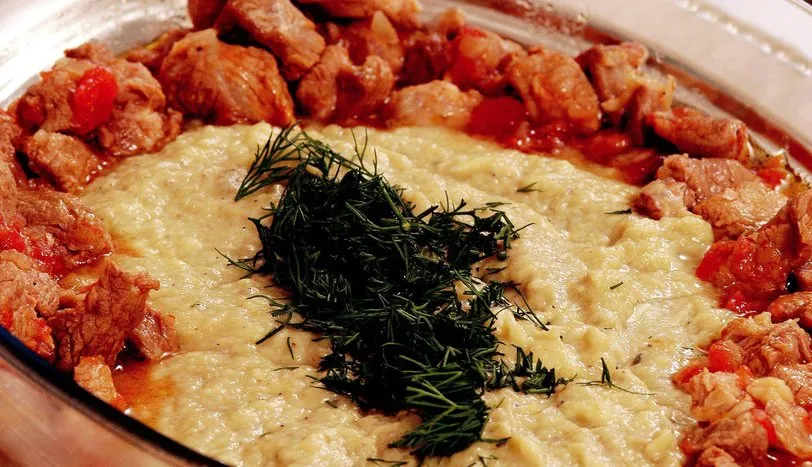 ÖNCELİKLE 1 çorba kaşığı yağda, küçük doğranmış soğan ve kuşbaşı kuzu etini kavurun. Domatesleri ilave ederek biraz daha kavurun. Tuz ve karabiber ekleyin. 3 su bardağı su ilavesi ile kaynamaya bırakın. Suyunu çekince altını kapatın. Patlıcanları közleyip, kabuğunu soyun ve robottan geçirin. Kalan yağda unu hafifçe kavurun. İçine patlıcan ve süt ilave ederek, tuzunu ekleyin. Kıvamlı bir hal alana kadar pişirip, kaşar peyniri ekleyerek karıştırın. Servis tabağının ortasına ilk olarak patlıcanlı karışımı koyun. Kenarlarına da et ekleyin. İnce kıyılmış maydanozla ve dereotuyla süsleyerek servis yapın.