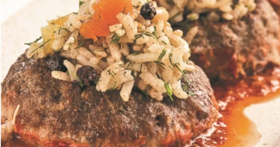 İç pilav için yağları pilav tenceresine alıp ısıtın ve fıstığı ekleyip kavurun. Yıkanıp suyu süzülmüş pirinç ve tuz ekleyip kavurmaya devam edin. Pirinç beyazlaşınca kuş üzümü, baharat, şeker ve su ekleyip karıştırın. Kapağını kapatıp kısık ateşte tüm suyunu çekene kadar pişirin. İnce kıyılmış dereotu ekleyin ve tencerenin üzerine kağıt havlu kapatıp 10 dakika demlenmeye bırakın. Demlenme işlemi bittikten sonra kuru kayısıları küp doğrayıp tencereye ekleyin ve karıştırın. Köfte için kıymayı geniş bir kaba alıp üzerine rendelenmiş soğan, yumurta, ıslatılıp suyu sıkılmış ekmek içi, kimyon, tuz ve karabiber ekleyip yoğurun. Harçtan avuç içi kadar parçalar koparıp içli köfte yapar gibi parmağınızla ortasını açarak şekil verin. Tepsiye koyup önceden ısıtılmış 200 derece fırında 15 dakika pişirin. Sos malzemelerini karıştırıp köftelerin üzerine gezdirin. 15 dakika daha pişirip fırından alın. Çanakların içine pilav doldurup sıcak servis yapın.