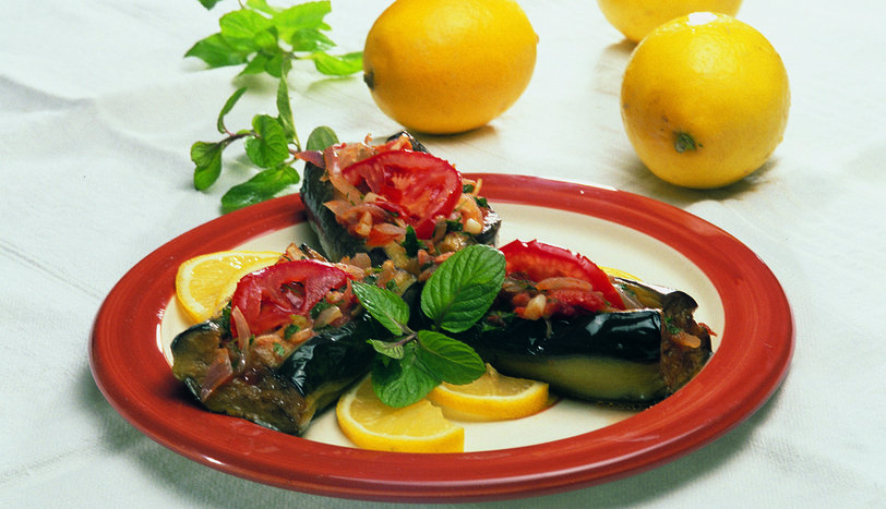 PATLICANLARI alaca soyup, büyük olanları ortadan ikiye bölün. Tuzlu suda 20 dakika bekletin. Daha sonra suyunu süzüp, ortalarını karnıyarık gibi kesin. Bir tavaya zeytinyağını alın. Piyazlık doğranmış soğanları, yağda 2-3 dakika soteleyin. Domatesleri küp doğrayın. Sarmısakları ikiye bölüp tavaya ilave edin. 5 dakika daha soteleyip, karışımı ocaktan alın. Şçine tuz, şeker, limon suyu ve ince kıyılmış maydanozu ilave edip, karıştırın. Patlıcanları sıvıyağda 2 dakika kızartın. Tavadan alıp, tencereye dizin. Hazırlanan içi patlıcanların yarılan kısımlarına doldurun. Üstlerine domates dilimi koyup, suyunu dökün. 15 dakika orta ateşte pişirin. Tencerenin kapağını açmadan soğutup, servis yapın.