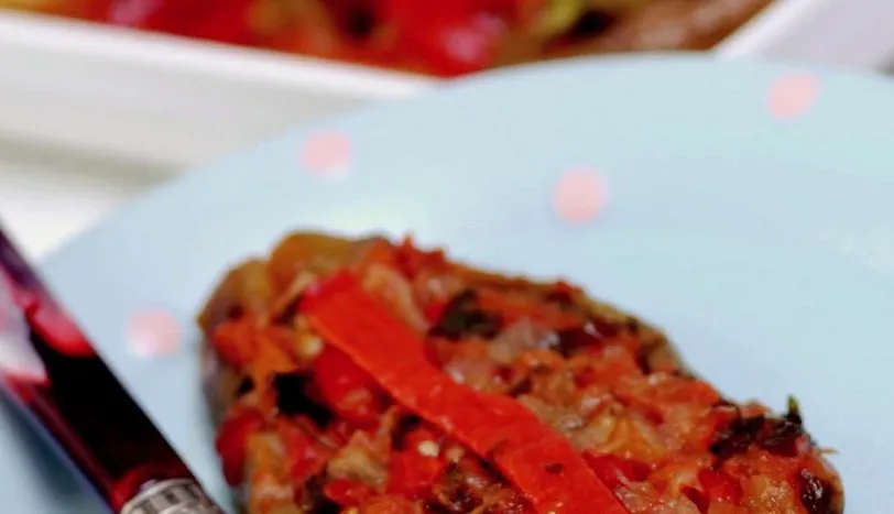 PATLICANLARIN kabuklarını bütün olarak soyun. 1'er tatlı kaşığı tuz ve tozşekeri karıştırıp patlıcanları bu karışıma bulayın. Bir kevgir içinde yarım saat bekletin. Yıkadıktan sonra iyice kurulayın. Üzerlerini sıvıyağ ile yağlayıp fırın tepsisine dizin. Önceden ısıtılmış 230 derece fırında önce harlı olarak 10 dakika, daha sonra ısıyı 200 dereceye getirip yumuşayana kadar pişirin. Bir tavaya aldığınız zeytinyağında ince kıyılmış sarmısak ve soğanları kavurun. Kabukları soyulmuş ve küp doğranmış domates, 2 tatlı kaşığı tozşeker ile tuz ilave edin. Domates suyunu çekince tavayı ocaktan alın. İnce kıyılmış maydanozu ilave edip karıştırın. Pişen patlıcanların ortalarını yarın ve hazırladığınız harcı içlerine pay edin. Üzerlerine biberleri yerleştirin. Tepsinin üzerini alüminyum folyo ile kapatıp 200 derece fırında 10 dakika daha pişirin. Soğuduktan sonra servis tabağına alın ve servis yapın.