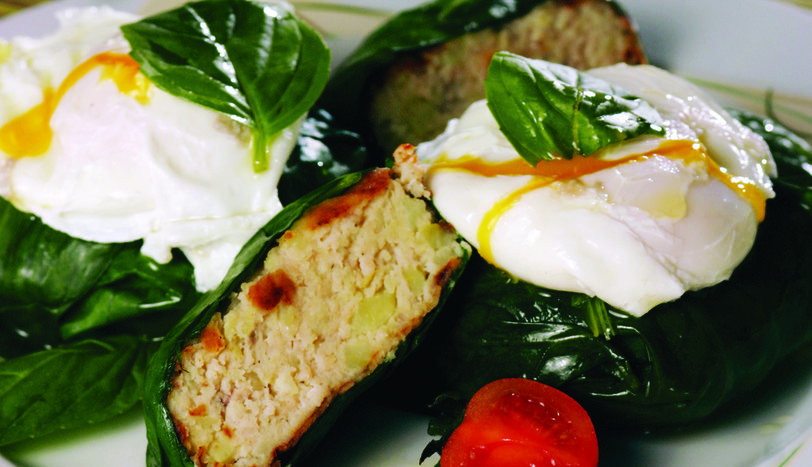 Haşlamış olduğunuz patateslerin kabuklarını soyup bir çatal yardımıyla iyice ezin. Somonu robotta kıydıktan sonra bir kaba alın, tuz ve karabiber ilave edip karıştırın. Ezilmiş patatesleri katıp köfte kıvamına gelene kadar yoğurun. Elinizi una bulayıp bu köfte harcından hamburger köftesi büyüklüğünde tombul köfteler yapın. Una buladığınız köfteleri 2 saat buzdolabında bekletin. Derin bir tavada kızdırdığınız yağda köftelerin her iki tarafını da 3'er dakika kızartın. Yıkamış olduğunuz ıspanak yapraklarını 1 su bardağı tuzlu kaynar suda 2 dakika haşlayın. Köfteleri ıspanak yapraklarına sarın ve bir tabağa alın. Bir tencerede 2 su bardağı su kaynatıp içine sirke ve bir tutam tuz atın. Yumurtaları suya kırıp beyazı pişinceye kadar 3 dakika pişirin. Pişmiş yumurtaları kevgir yardımıyla süzerek sudan çıkarın ve köftelerin üzerine koyun. Üzerlerine zeytinyağı gezdirip ıspanak yaprakları ve limon dilimleriyle süsleyin.