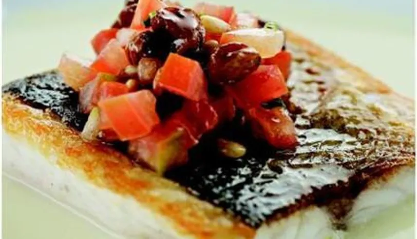 1.Vinaigrette için şeri sirkesini bir tavada kaynama noktasına kadar ısıtın. Maydanoz ve çekirdeksiz kuru üzüm, zeytinyağı, çamfıstığı ve doğranmış domatesleri ekleyip ateşten alın. Lezzetlendirmek üzere terbiyeleyin.