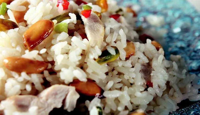 1.Badem ve antep fıstığını ayrı kaplara alıp ocağa oturtun. Biriki dakika kaynatıp süzün ve kabuklarını soyun. Tavuk etini tuzlu suda haşlayın. Süzüp küçük doğrayın ve kenara alın.