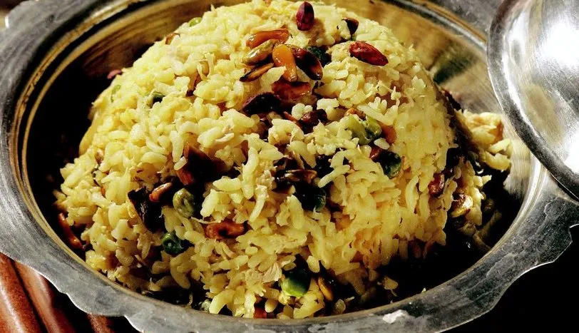 Tavuk etini haşlayın. Suyunu süzüp kenara alın. Safranı yarım kahve fincanı suda yarım saat bekletin. Diğer taraftan pirinçleri yarım saat tuzlu suda beklettikten sonra yıkayıp suyunu süzün. Tereyağını eritip bademleri 1-2 dakika kavurun ve üzerine pirinçleri ekleyin. Birlikte 5 dakika daha kavurun. Safranı tavuk suyuna karıştırın. Tavuk etlerini elinizle didikleyin. Bezelye, zencefil ve tuzu, kavurduğunuz pirince ekleyin. Üzerine safranlı tavuk suyunu ekleyip suyu çekilene kadar kısık ateşte pişirin. Ocağı kapatıp fıstıkları pilava ekleyip karıştırın. Demlendirdikten sonra servis yapın.