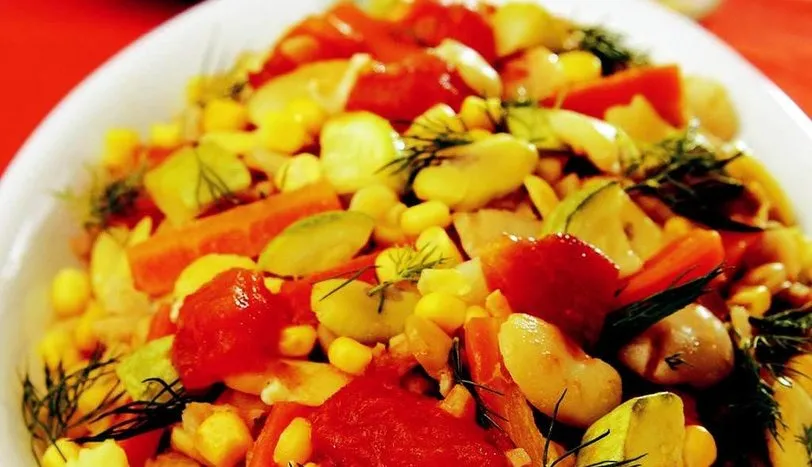 BAKLAYI kaynar suda 2-3 dakika haşlayıp süzün. Soğuk sudan geçirip, dış kabuklarını elinizle temizleyin. Zeytinyağını derin bir tencerede kızdırın. Kıyılmış soğan ve sarmısağı ekleyip soteleyin. Küp doğranmış kabak ve mısırı ilave edip karıştırın. Tencerenin kapağını kapatıp, 10 dakika dinlendirin. Üzerine küp doğranmış domates ve baklayı ekleyin. 5-10 dakika daha pişirip, tuz ve karabiberini ayarlayın. Ocaktan alın ve tencerenin kapağını açmadan ılınmaya bırakın. Ilık olarak, kızartılmış yufkalarla birlikte servis yapın.
