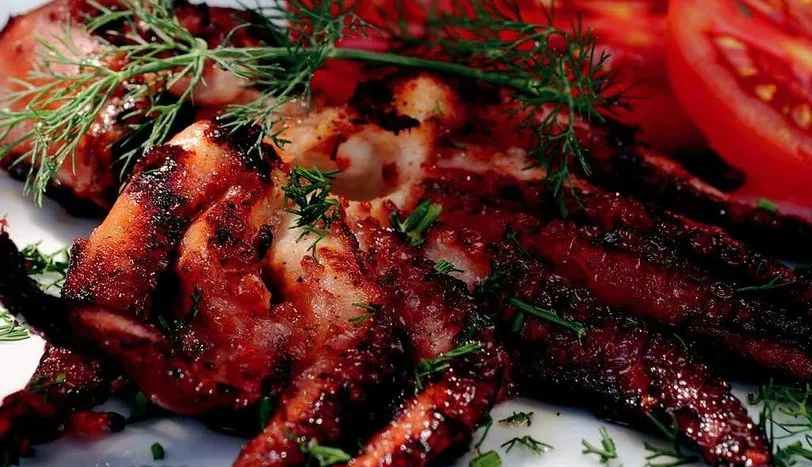 Ahtapotu tuz, şeker ve sirke eklediğiniz suda yumuşayana kadar haşlayın. Kabuğunu soymadan kenara alın. Diğer taraftan domatesin kabuğunu soyarak bir tavaya koyun. Üzerine tuz ve arzunuza göre baharat ekleyerek kıvamlı bir sos haline gelene kadar pişirin. Ahtapotu, hazırladığınız domates sosa bulayın. Daha sonra önlü arkalı ızgara edin. Servis tabağına alıp, domates dilimleri ve kıyılmış dereotu ile süsleyerek servis yapın.