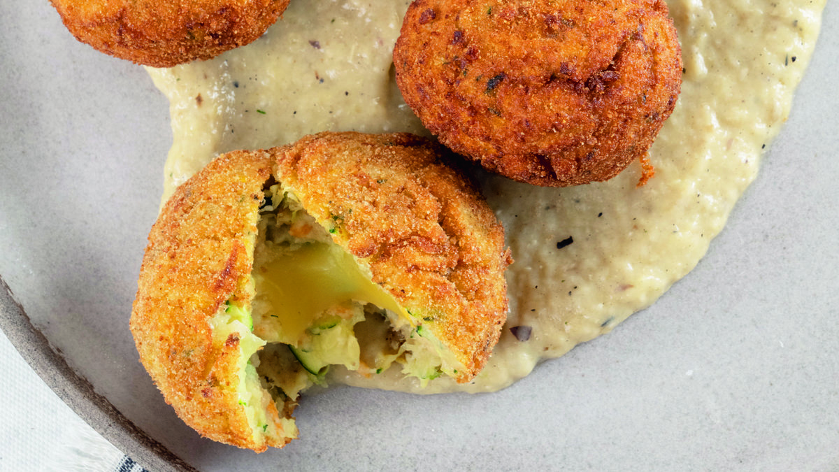 Kaplamak ve kızartmak için hamur toplarını önce çırpılmış yumurtaya sonra galeta ununa bulayın. Sıcak ayçiçeği yağında kızartın.