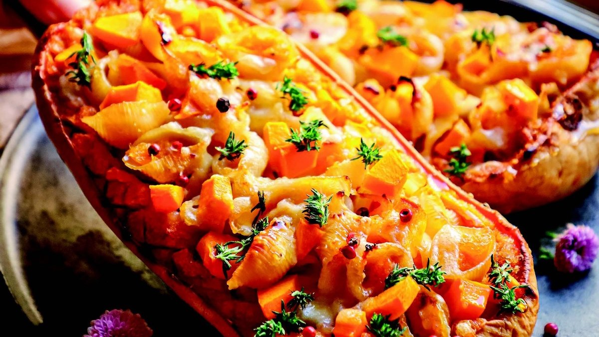 Kabağı boydan ikiye kesin. Çekirdeklerini ve lifli kısmı temizleyin. İçindeki etli kısmın bir bölümünü kaşıkla çıkarın.