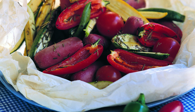 Bütün sebzeleri ve sosisleri irice doğrayın. Biberiyeyi ekleyin. Çok az tuz ekleyin. Yağlı kağıda koyup, üzerini kapatın. 200 derece fırında 30-35 dakika kadar pişirin. Fırından alıp, kağıdı çıkarın. Sıcak olarak servis yapın.