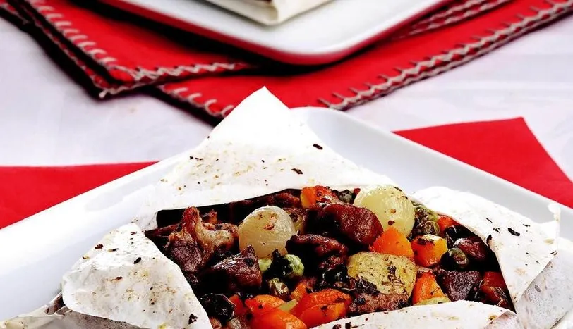 ETİ bir tencereye alıp suyunu salıp yeniden çekinceye kadar kavurun. Üzerine su ilave edip kısık ateşte pişmeye bırakın. Diğer taraftan, soğanları temizleyin. Havuç ve patatesleri soyup küp doğrayın. Et suyunu çekince, üzerine sıvıyağ, soğan, havuç patates ve bezelye ilave edip sebzeler yarı yarıya yumuşayana dek pişirin. Tuz, karabiber, pulbiber ve kekik ekleyip bir-iki dakika daha pişirip ocaktan alın. Yağlı pişirme kağıdından 30x30cm ebadında dört parça kesin. Orta kısımlarına eti paylaştırın. Kağıtların iki kenarını etin üzerine kapatıp dikdörtgen haline getirin. Yan kısımlarını kendi üzerine bir-iki kez kıvırarak, kare yapın. Katlanmış kısımları aşağıda kalacak şekilde bir fırın tepsisine yerleştirin. Üzerlerini suyla hafifçe ıslatın. Önceden ısıtılmış 180 derece fırında 45 dakika pişirip servis yapın.