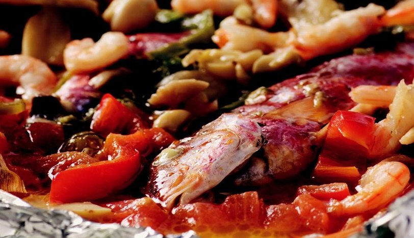 Barbunyayı temizleyip, bol suyla yıkayın. Suyunun süzülmesi için süzgece alın. Fırın tepsisinin içine kenarlardan taşacak şekilde alüminyum folyo serin ve içine balığı yerleştirin. Bir tavada tereyağını eritip, küp doğranmış sivri biberi soteleyin. Daha sonra küp doğranmış domates, kıyılmış sarımsak, rendelenmiş soğan, karides ve mantarı ilave edin. 1-2 dakika daha sotelemeye devam edin ve baharatları ilave edin. Tüm malzemeyi şöyle bir karıştırdıktan sonra balıkların üzerine boşaltın. Suyu gezdirin ve kenardan taşan alüminyum folyoyu üzerini tamamen örtecek şekilde kapatın. Önceden ısıtılmış 200 derece fırında 15 dakika pişirin. Fırından aldıktan sonra folyoyu açıp, sıcak olarak servis yapın. Üzerine limon gezdirebilirsiniz.