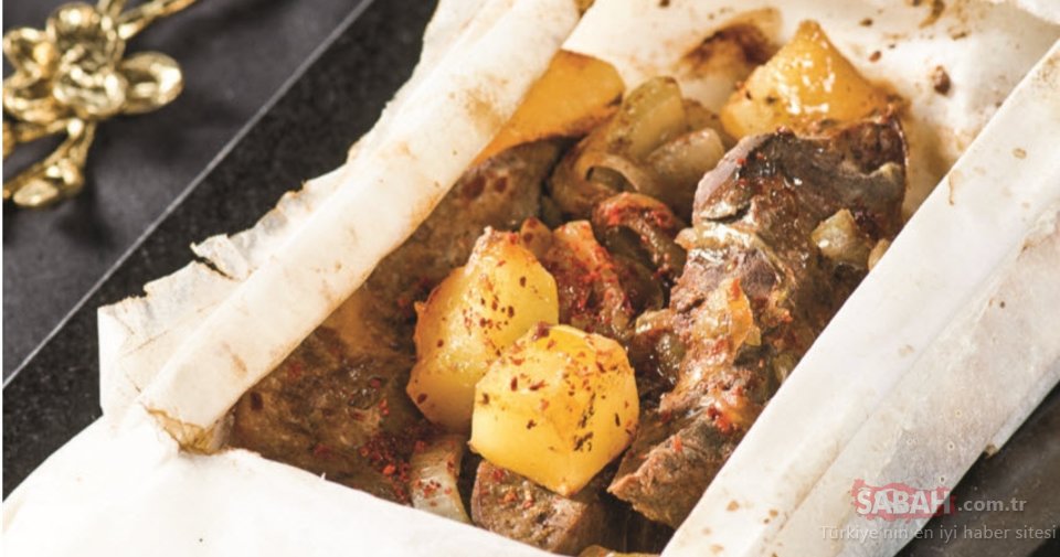 Ciğerin zarını çıkarıp iyice yıkayın ve büyük parçalar şeklinde dilimleyin. Soğanı halka doğrayıp, sarımsağı kıyın. Ciğer, soğan, sarımsak, küp doğranmış patates, zeytinyağı ve kalan malzemeyi harmanlayın. Pişirme kağıdının ortasına yerleştirip, hava almayacak biçimde ve zarf şeklinde kapatın. Fırın tepsisine yerleştirip, önceden ısıtılmış 180 derece fırında yaklaşık 30 dakika pişirin. Kimyon serpip servis yapın.