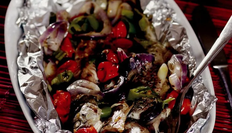 Bir kasenin içinde piyazlık doğranmış soğan, ince kıyılmış biber, ortadan ikiye kesilmiş domates, kekik, tuz ve sıvı yağı karıştırın. Alüminyum folyonun içine 1 adet ayıklanmış balığı yerleştirin. Üzerine hazırladığınız harçtan 2 çorba kaşığı yayın ve folyonun ağzını kapatın. Diğer balıkları da aynı şekilde hazırlayın. Fırın tepsisine dizdiğiniz balıkları önceden ısıtılmış 160 derece fırında 15 dakika pişirin.