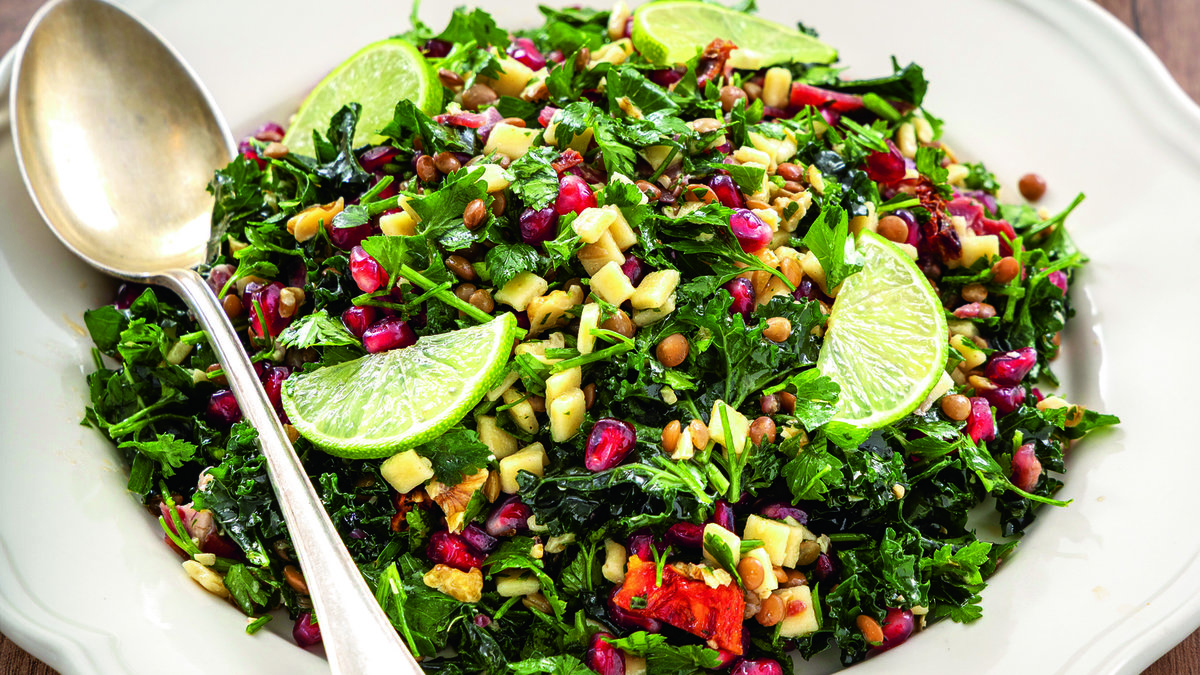 Haşlanmış makarnayı kahverengi mercimeği, tanelenmiş narı, kıyılmış maydanoz ve kale yaprağını derin bir kaseye alın. Üzerine cevizi kuru domatesleri ve ince doğranmış pastırmayı ilave ederek karıştırın.
