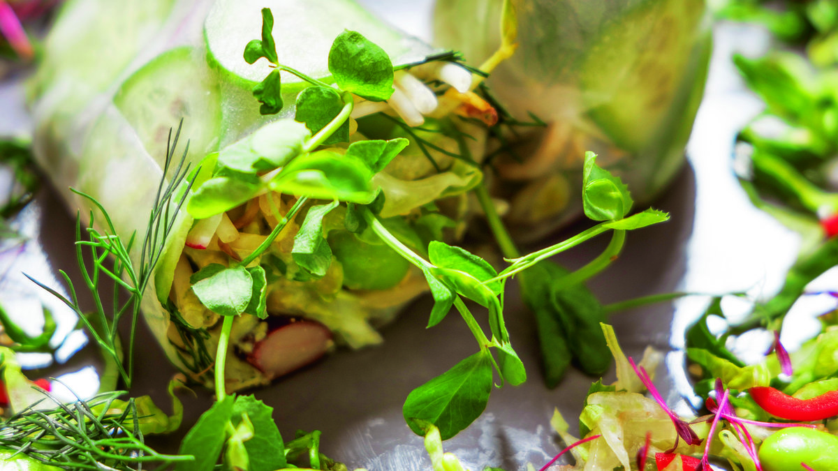 Pirinç yufkasının ortasına ince dilimlenmiş salatalık, turp ve avokadoyu yerleştirin. Üzerine kaju sosundan sürün. Kale yapraklarını ve yeşillikleri ekleyin. Haşlanmış bakliyat karışımını ve acı kırmızıbiberleri serpiştirin.