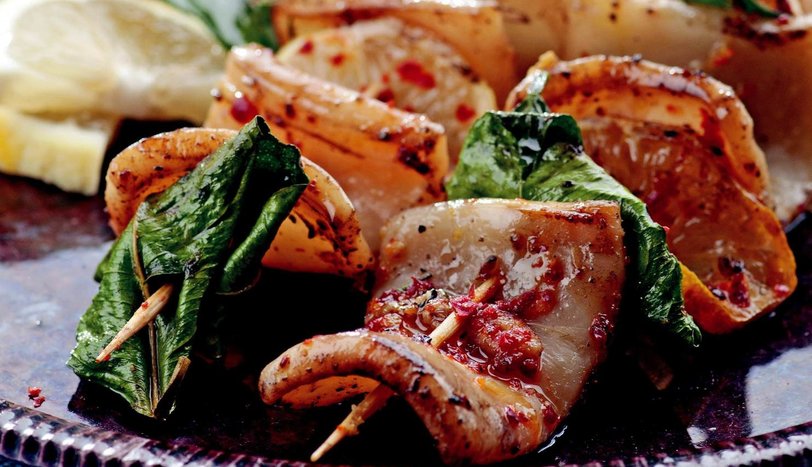 Daha sonra kalamar dilimlerini aralarına limon yaprağı ve dilimleri koyarak 1.5- 2 saat suda beklettiğiniz çöp şişlere geçirin. Mangala koyun ve çevirerek pişirin.