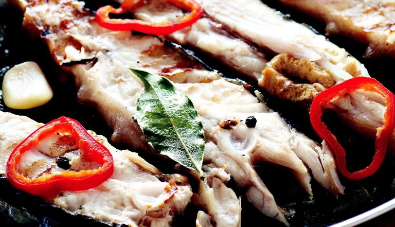 Temizlenmiş kalkanı dilimleyin ve ızgara yapın. Yağlanmış fırın tepsisine yerleştirip, üzerine kıyılmış sarımsak, mantar, arpacık soğan, kırmızı biber ve defne yaprağını koyun. Tuz ve karabiber serpin, zeytinyağı gezdirin.