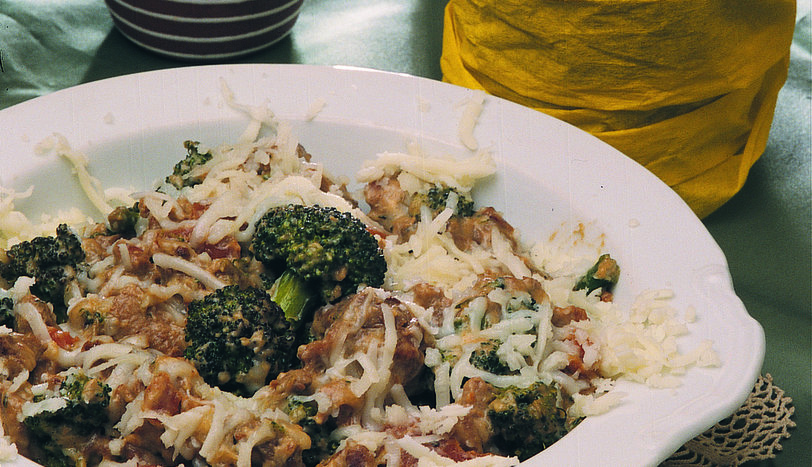 Hİndİ etlerini yapışmaz yüzeyli tavaya alın. Suyunu bırakıp çekene kadar pişirin. Zeytinyağı, ince kıyılmış sarmısak ve küçük doğranmış havucu ilave edin. Arasıra karıştırın. Etler pişince, parçalara ayırdığınız brokolileri ekleyin. Arasıra karıştırarak 7-8 dakika pişirin. Tuz, baharat ve soya sosunu ekleyip karıştırın. Bu arada beşamel sos için zeytinyağında unu hafifçe kavurun. Sütü ekleyip karıştırarak pişirin. Beşamel sosu yemeğe ekleyip karıştırın ve 2 dakika daha pişirin. Yemeğin üzerine rendelenmiş kaşar peyniri serpip tencerenin kapağını kapatın. 2-3 dakika bekleyip servis yapın.AŞÇININ NOTUHindi etini pişirmekte zorlanırsanız, önceden kendi suyunda 20-25 dakika tencerenin kapağı kapalı olarak pişirebilirsiniz. Ayrıca bu yemeği ince kıyılmış lahana yapraklarıyla da pişirebilirsiniz