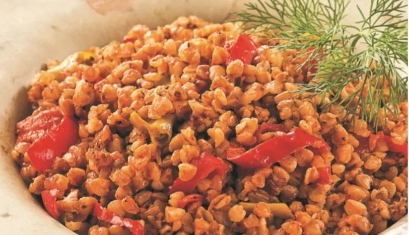 Tereyağını tencerede alıp eritin. Kıyılmış soğan ve biberleri ilave edip 2 dakika soteleyin. Salça ekleyip bir iki karıştırın. Karabuğday, tavuk suyu, su, tuz ve karabiber katın. Kaynayana dek harlı, kaynadıktan sonra kısık ateşte ve kapağı kapalı suyunu çekene dek pişirin. Ocaktan alıp, tahta kaşıkta harmanlayın ve 5 dakika dinlendirip ılık servis yapın.