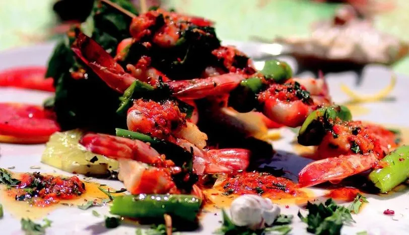 Öncelikle marine için zeytinyağı, soya sosu, pul biber ve kekiği karıştırın. Karidesleri bu karışımda yarım saat bekletin. Marine edilmiş karides ve iri doğranmış sivri biberleri şişlere dizip, ızgara yapın ve servis tabağına alın. Sos için, közlenmiş domates ve biberleri blendere alın. Üzerine sarımsak, zeytinyağı, tuz ve karabiber ekleyip blenderden geçirin. Hazırladığınız sosu ızgara karideslerin üzerine gezdirip, servis yapın.