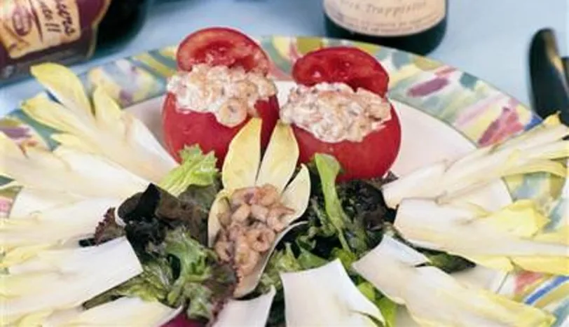Haşlanmış karidesleri mayonezle karıştırarak, içi oyulmuş domateslerin içine doldurun. Üzerine vinaigrette sos gezdirilmiş yeşilliklerin üzerine domatesleri yerleştirin. Servis yapın.