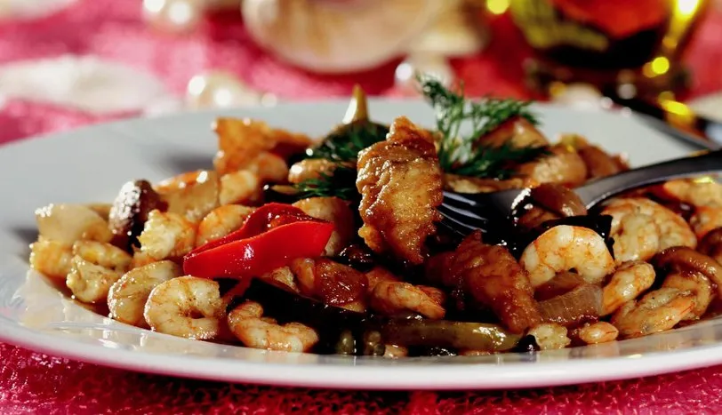 Kalkanı bir parmak uzunluğunda doğrayıp sıvı yağda kızartın ve bir kenara alın. Diğer tarafta tereyağında ince kıyılmış sivri biber ve sarımsağı kavurun. Mantar, karides ve küp doğranmış domatesi ilave edip, kavurmaya devam edin. En son soya sosunu katın ve 1-2 defa çevirdikten sonra kızarmış balığın üzerine dökün. Sıcak olarak servis yapın.