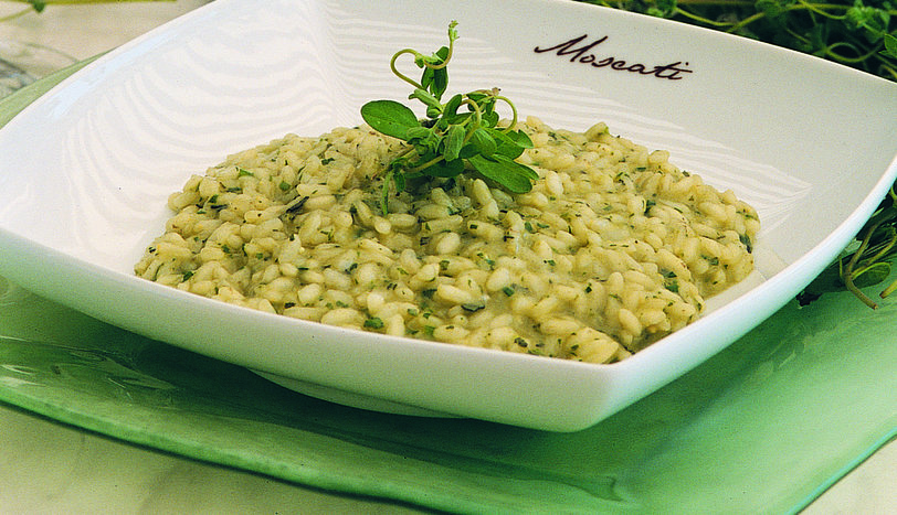 Soğanı zeytinyağı ile yavaşça kavurun. Pirinci ekleyip, kavurmaya devam edin. Ardından ince kıyılmış yeşilliği ve bir buçuk su bardağı tavuk suyunu ekleyin. 18 dakika kadar pişirin (Risottonun kıvamının hafif sulu olması gerekiyor. Eğer tarifte verilen su miktarı az gelirse, biraz daha ekleyebilirsiniz.) Ocaktan alınca, üzerine parmesan peyniri serpip servis yapın.