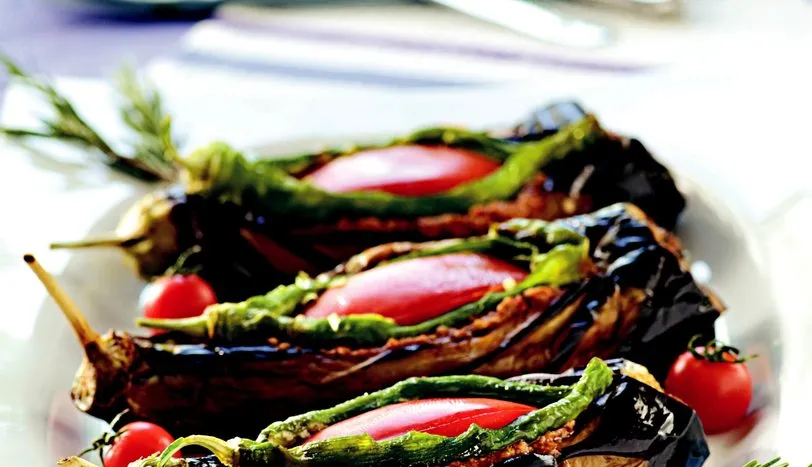 PATLICANLARI alacalı soyup ortalarına boydan boya çizik atın. Acısını almak için tuzlu suda 15 dakika bekletin. Kurulayıp kızgın yağda önlü arkalı kızartın. Fazla yağını almak için kağıt havlu üzerine çıkarın. Soğan, domates, çarliston biber ve sarmısağı temizleyip ince kıyın. Margarini bir tavaya alıp kıymayı ilave edin ve suyunu salıp yeniden çekinceye kadar kavurun. Üzerine soğan ve sarmısak ekleyin. Soğanın rengi dönünce kıyılmış biber, domates ve salça ekleyip kavurun. Su katıp, 15 dakika pişirdikten sonra suyunu süzün. Kıymalı harca kıyılmış maydanoz, tuz ve karabiber ilave edin. Patlıcanları bir fırın tepsisine yerleştirin. Harcı içlerine paylaştırın. Sivri biberleri temizleyip her patlıcanın üzerine bir adet koyun. Süzdüğünüz suyu üzerlerine gezdirin. Önceden ısıtılmış 180 derece fırında 15-20 dakika pişirip servis yapın.