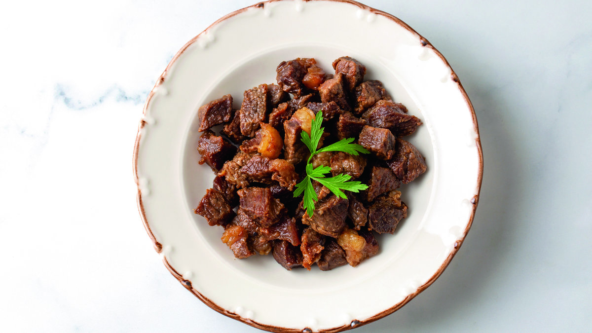 Eti bir gece dinlendirdikten sonra sinirlerini temizleyerek kuşbaşı doğrayın. Genişçe bir tencereye alıp kapağı kapalı şekilde kendi suyunu salıp yeniden çekene kadar önce harlı sonra suyunu çekmeye başlayınca kısık ateşte kavurun. Ara sıra karıştırın. Pişerken üzerinde biriken köpüğü kaşık yardımı ile alıp atın.