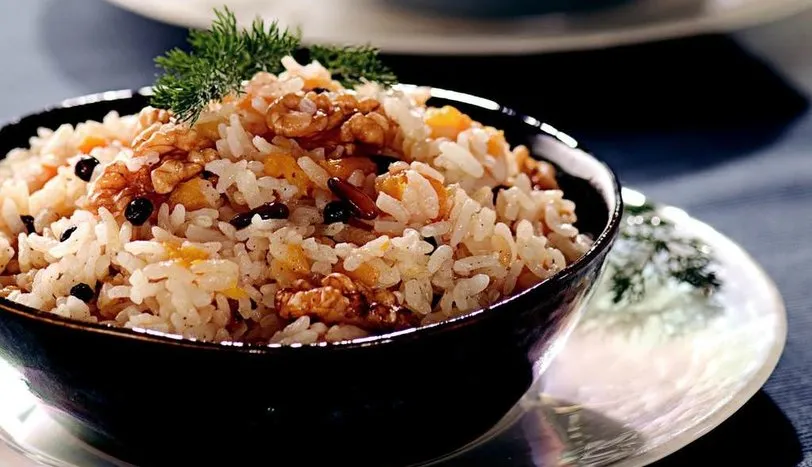 Pirinci ılık tuzlu suda 20 dakika bekletin. Küp doğranmış soğanı tereyağında rengi dönene kadar kavurun. Üzerine dolmalık fıstık ilave edip, pembeleşene kadar kavurmaya devam edin. Doğranmış kayısı, kuş üzümü, şeker, tarçın, tuz, karabiber ve tavuk suyu ekleyin. Pirinci yıkayıp süzdükten sonra cevizle birlikte tencereye katın. Birkaç dakika hızlı daha sonra kısık ateşte suyunu çekene dek pişirin. Üzerine kağıt havlu kapatıp 10 dakika demlendirdikten sonra servis yapın.