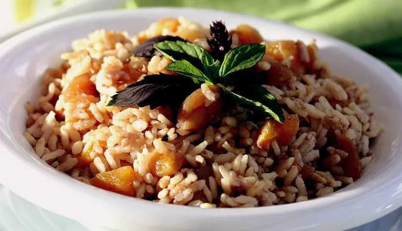 Pirinci sıcak tuzlu suda yarım saat beklettikten sonra suyunu süzün ve bol su ile yıkayın. Diğer taraftan ince kıyılmış soğanı tereyağında hafifçe kavurun. İçine pirinç, ince doğranmış kuru kayısı ve cevizi ilave edin. Su, toz şeker, tuz ve karabiber ekleyin. Kısık ateşte pirinç suyunu çekene kadar pişirin. 10 dakika demlendirdikten sonra sıcak olarak servis yapın.