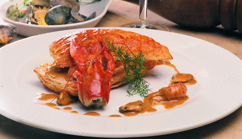 Kerevitleri sıcak suda haşlayıp ayıklayın. Kabuklarını ve kafalarını sos yapmak için ayırın. Derin bir tavada zeytinyağını kızdırın. Kerevit kafalarını ve kabuklarını tavada soteleyin. Konyak ile flambe edin. Küp doğranmış soğan ve pırasaları ekleyip karıştırın. Soğan ve pırasalar kavrulunca sarımsakları ekleyin. Sotelenince iri doğranmış domates, portakal kabuğu ve defne yaprağını ilave edin. Domatesler ezilmeye başlayınca salçayı ekleyerek karıştırın ve kavurun. Suyu ekleyip kaynatın. Sosu kaynatıp çektirin ve süzün. Sos süzüldükten sonra nişastayı ekleyin ve midyeleri içine atıp pişirin. Midyelerin pişmesine yakın, kerevitleri ekleyin. Krema, tuz ve karabiber ilave edin. Milföy hamurunu dikdörtgen olarak açıp ikiye kesin. Önceden ısıtılmış 180 derece fırında hamurları pişirin. Kabaran milföyün alt kısmını servis tabağına alın. Üzerine midye ve kerevitleri yerleştirin. Milföyün üst kısmını kapak gibi oturtun. Tabağın kenarına sosu gezdirin. Dereotu ile birlikte servis yapın.
