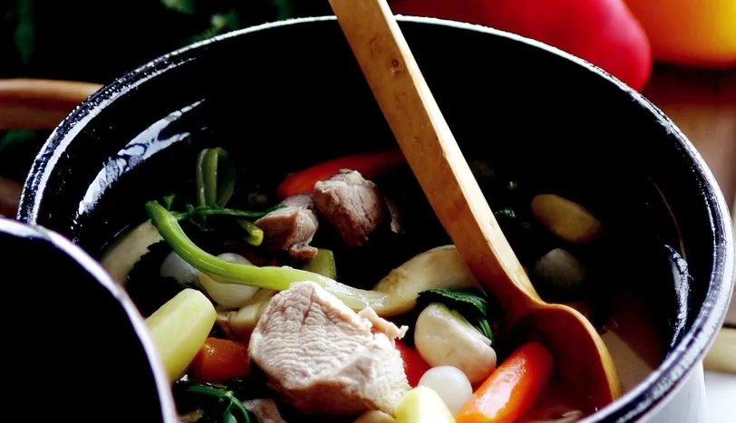HİNDİ butlarını kuşbaşı şeklinde doğrayın. Bir tencereye alıp üzerini geçecek şekilde su ile doldurun ve bir defa kaynatıp süzün. Başka bir tencerede tereyağı ve mısırözü yağını birlikte eritin. Daha sonra unu ilave edin. 1-2 dakika kavurduktan sonra suyu ekleyin. Patates, kereviz, havuç ve kabağı temizleyip kuşbaşı şeklinde doğrayın. Arpacak soğanları soyup ikiye ayırın. Taze soğanı ve mantarları ince ince dilimleyin. Hindi etlerini ve kereviz yaprakları ha- riç doğranmış tüm sebzeleri ekleyin. Tuzu ilave edip karıştırın. Bir defa kaynadıktan sonra kısık ateşte yarım saat kadar pişirin. Son olarak kereviz yapraklarını ilave edin. 5 dakika kadar beraber kaynatıp servis yapın.