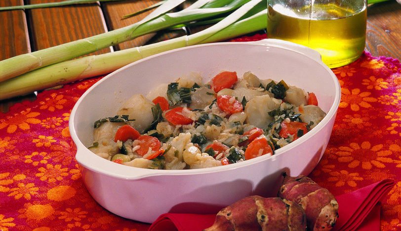 Öncelİkle havucu soyup halka halka doğrayın. Tencerenin dibine serpiştirin. Pırasa yapraklarını halka halka doğrayıp serpiştirin. Kerevizi rendeleyip tencereye alın. Yerelmalarını ayıklayıp küçük küçük doğrayın. 1 çorba kaşığı pirinci yıkayıp tencereye alın. Soyulmuş arpacık soğanları en üste dizin. 4 çorba kaşığı zeytinyağı, tuz ve 1 tatlı kaşığı tozşekeri ekleyip hiç su ilave etmeden kısık ateşte 20 dakika kadar pişirin. Servis tabağına alıp maydanozla süsleyin.