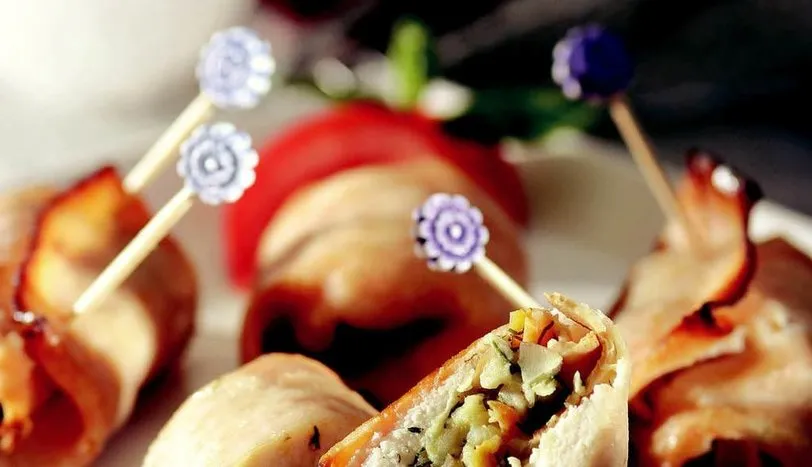 karabiber, tarçın ve ince kıyılmış dereotunu karıştırın. Kestaneli karışıma kremayı yavaşça ilave edin. Tavuk göğsünü 4 ince dilim olacak şekilde kesin. Hindi fümenin üzerine 1 adet tavuk dilimi yerleştirin. Hazırladığınız kestaneli harçtan biraz koyup, sarma yapar gibi sarın. Açılmaması için kürdanla tutturun. Kalan malzemeyi de aynı şekilde hazırlayın. 1 çorba kaşığı sıvıyağ ile fırın tepsisini yağlayın ve hazırladığınız tavuk sarmaları yerleştirin. Önceden ısıtılmış 180 derece fırında 20-25 dakika pişirin. Sıcak olarak servis yapın