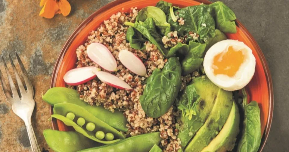 Kırmızı ve beyaz kinoayı karıştırıp, yıkayın ve suyunu süzün. Su ilave edip ocağa oturtun ve suyunu çekene dek pilav gibi pişirin. Ocaktan alıp, ılındıktan sonra limon suyu, sirke ve tuz ekleyip harmanlayın. Geniş bir tabağa alıp, etrafına soğan, bezelye, ıspanak, ikiye kesilmiş turp, dilimlenmiş avokado ve yumurta yerleştirip servis yapın.
