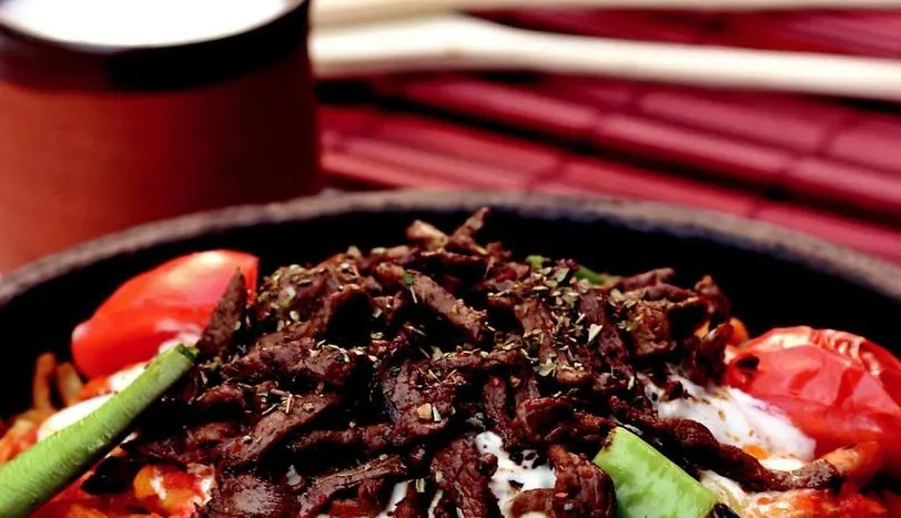 Eti bir parmak kalınlığında uzun şeritler halinde doğrayıp kenara alın. Patlıcanı közleyip, kabuklarını soyduktan sonra bir çatalla ezin. Jülyen (kibrit çöpü şeklinde) doğranmış patatesi sıvıyağda kızartın. Güveç kabının dibine patlıcanı yerleştirin. Üzerine kızartılmış patates ve çırpılmış yoğurdu koyun. Diğer taraftan bir tavaya tereyağı, et, küp doğranmış domates, tuz, kekik, karabiber ve pulbiberi alın. Et yumuşayana kadar kısık ateşte pişirin. Pişen etli karışımı güveçteki yoğurdun üzerine boşaltın. Önceden ısıtılmış 200 derece fırında yarım saat pişirin. Sıcak servis yapın.