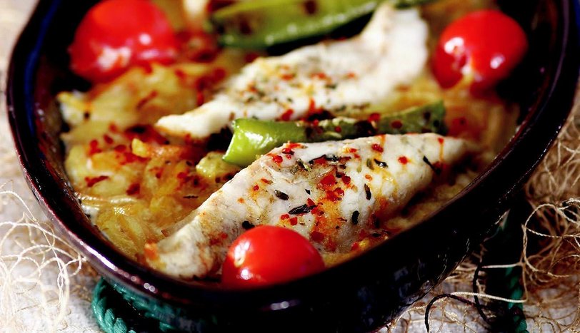 Kırlangıç filetoyu ızgara yapın ve patatesin üzerine yerleştirin. Kaparili sosu balığın üzerine yayın. İkiye bölünmüş kiraz domates ve sivri biberleri yerleştirip önceden ısıtılmış 200 derece fırında 5 dakika pişirin. Üzerine pul biber ve kekik serpip sıcak olarak servis yapın. - 2