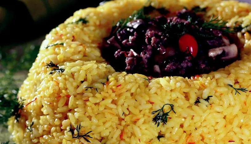 Pirinci yıkayıp yarım saat sıcak suda bekletin. Sıvı yağı bir tencereye alıp üzerine süzülmüş pirinci ve safranı ilave edin. Pirinç beyazlaşana kadar kavurun. Tuz ve üzerini geçecek kadar sıcak su ekleyip orta ateşte pişmeye bırakın. Suyu yarı yarıya çekilince ocağı kısıp pirinç, suyu tamamen çekinceye kadar pişirin. Ocağı kapatıp pilavın üzerine kağıt bir havlu koyup, tencerenin kapağını kapatın ve demlenmeye bırakın. Diğer taraftan kıymalı harcı hazırlamak için, sıvı yağı kızdırıp kıymayı üzerine ekleyin. Suyunu salıp çekinceye kadar kavurun. Üzerine doğranmış mantarları ilave edin. Kıyılmış dereotu, tuz ve pul biber ekleyin. Pilavı ortası boş bir kek kalıbına koyarak şekillendirin. Ters çevirerek bir servis tabağına alın. Ortasındaki boş kısma hazırladığınız kıymalı harcı yerleştirin. Kiraz domates ve dereotu ile süsleyerek, servis yapın.