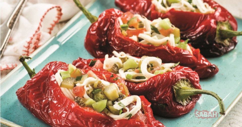 Kırmızı biberlerin üst kısmına karnıyarık yapar gibi kesik atarak ortasını açın. Çekirdeklerini çıkarıp hazırladığınız karışımı içlerine doldurun ve servis yapın.