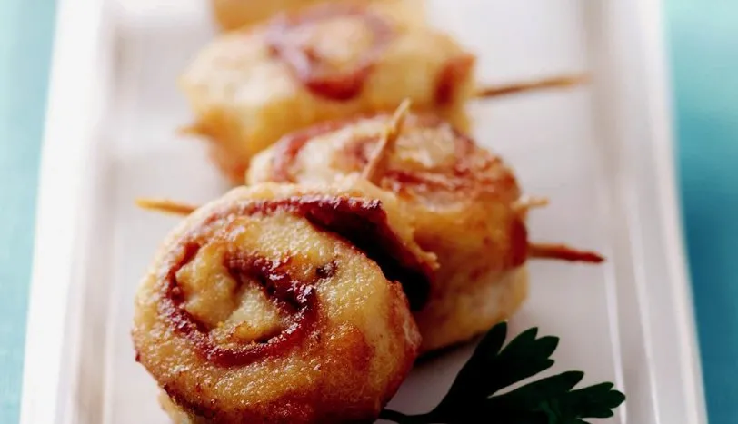 TAVUK göğüslerini düz bir zemine serin. Üzerine toz kırmızıbiber, kekik, tuz ve karabiber serpin. Bir dilim jambon koyun ve tavuğu rulo şeklinde sarıp, kürdanla tutturun. Diğer tavuk etlerini de aynı şekilde hazırlayın. Ruloları 2 parmak genişliğinde kesin ve mısır ununa bulayın. Kızdırılmış fındık yağında kızartın. Sos için un ve tereyağını unun kokusu çıkana kadar kavurun. İçine soğuk sütü katın ve sürekli karıştırarak kıvamlı bir sos elde edin. Soğuduktan sonra ceviz, sirke, hardal ve tuz katıp, karıştırın. Tavuk rulolarıile birlikte servis yapın.