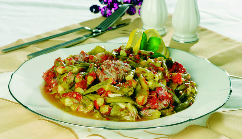 Öncelikle köfteyi hazırlayın. Bunun için, soğanı incecik kıyın. Ekmeği ıslatıp sıktıktan sonra, soğanla birlikte kıymaya karıştırın. Tuz ve karabiber ekleyip iyice yoğurduktan sonra, fındık iriliğinde parçalar koparıp yuvarlayın. Bamyaları ayıklayıp sirkeli suda 20-30 dakika bekletin. Margarini eritip içine yemeklik doğradığınız soğan ve domatesleri koyun ve birkaç dakika soteleyin. Üzerine köfteleri, bamyayı, limon suyu ve tuzu ekleyin. Sıcak suyu ilave edip, 35–40 dakika pişirin.