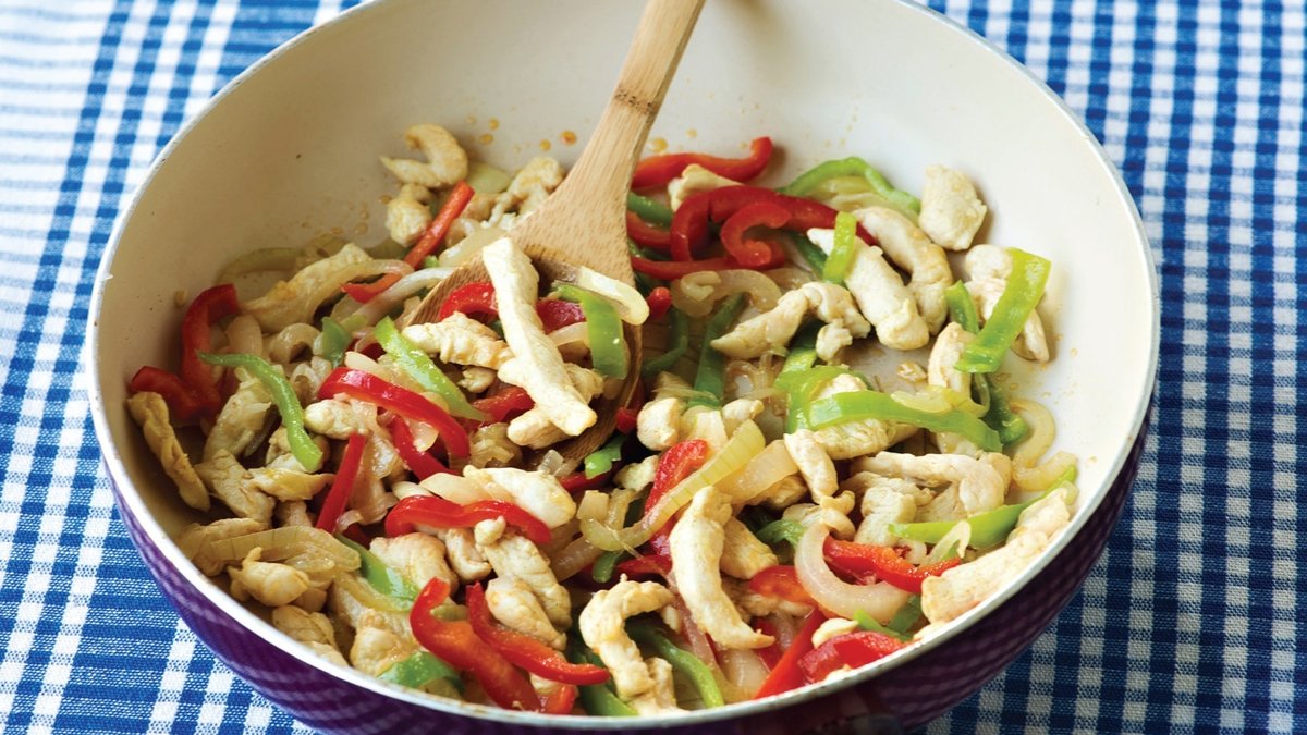 Tavuk dilimlerini bu karışımda yarım saat bekletin. Kalan zeytinyağını yapışmaz yüzeyli bir tavaya alın. Üzerine piyazlık doğranmış soğan ve baharatlı tavuk dilimlerini katın.