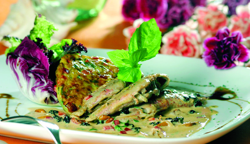 ZeytinyağIı yapışmaz yüzeyli tavaya alın. Dolmalık fıstıkları pembeleşene kadar kavurun. Kuş üzümlerini ve taze çekilmiş beyaz biberi ilave ederek 1-2 taşım kaynatın. Temizlenmiş ve yıkanmış tekirleri bu karışımda pişirin. Tuzunu ayarlayın. En son çiğ krema ve ince kıyılmış maydanozu katarak 1-2 dakika daha pişirin. Balıkları, patatesli pankekle beraber servis yapın.